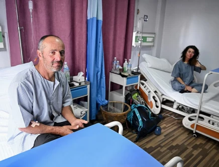Avalanche survivors France's Didier Armand Berton (L) and Isabelle Thaon sit inside a ward at the Era Hospital in Kathmandu on November 4, 2025. Photo: AFP