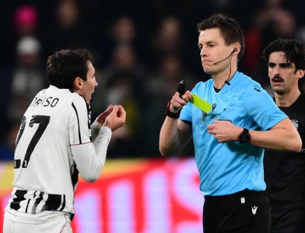 Juventus' Andrea Cambiaso receives a yellow card from German referee Daniel Siebert during the UEFA Champions League - league against Sporting CP at the Allianz stadium in Turin. PHOTO: AFP