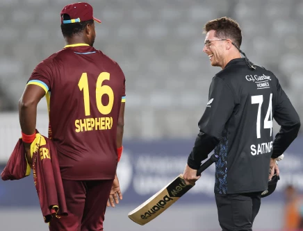 New Zealand s Mitchell Santner (R) and West Indies Romario Shepherd talk after the first Twenty20 international cricket match at Eden Park in Auckland on November 5. PHOTO: AFP