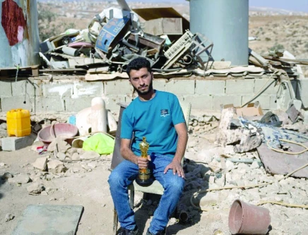 Basel Adra holds up his Oscar in the village of At Tuwani in the occupied West Bank. Photo: Al Monitor