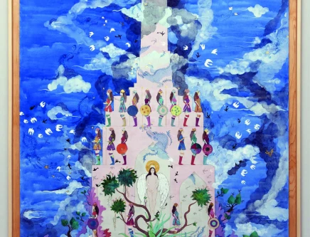 The painting exemplifies Schahbaz's mastery of miniature art — a discipline she first encountered as a student at Lahore's National College of Arts, where she trained in the Indo-Persian style known for its exacting precision.