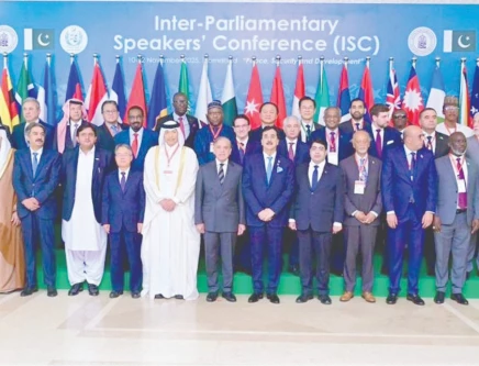 Prime Minister Shehbaz Sharif poses for a group photo at the Inter-Parliamentary Speakers’ Conference in Islamabad. Photo: EXPRESS
