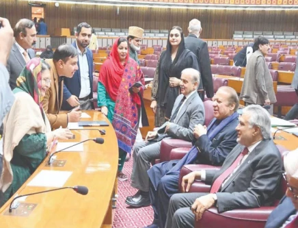 Prime Minister Shehbaz Sharif and PML-N Quaid Nawaz Sharif interact with MPs during the National Assembly session. PHOTO: NNI