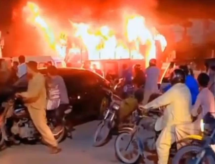 Flames rise from a passenger coach set ablaze by an angry mob after a speeding bus fatally hit a man and injured his nephew in Karachi’s Korangi Industrial Area. Photo: Express