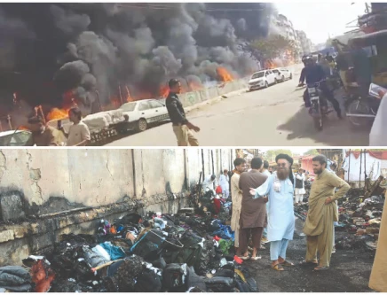 The fire erupted suddenly among the temporary vendor setups, within the jurisdiction of Kharadar police station. The flames spread rapidly, engulfing dozens of stalls. Police, fire brigade, and rescue teams rushed to the site to contain the blaze.