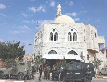 Israeli security forces stand next to their vehicles as they inspect the Hajja Hamida Mosque after it was reportedly set on fire and vandalised by Israeli settlers in the Palestinian village of Deir Istiya, near Salfit in the Israeli-occupied West Bank. Photo: AFP151555555555555qqqqqqqqqqqqqqqqf1111111q521111111111