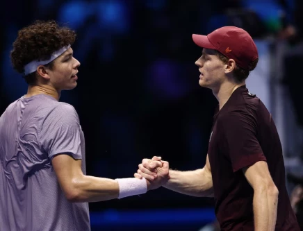 Jannik Sinner shakes hands with Ben Shelton after winning their group stage match. PHOTO: REUTERS