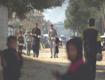 Palestinians carry pots with food west of Deir al-Balah city in the central Gaza Strip. Photo: AFP