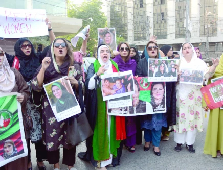 TI’s women-wing workers gather in a charged yet composed demonstration, protesting what they called mistreatment of Imran Khan’s sisters. Photo: Express