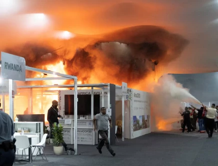 Shortly after lunchtime, however, security footage showed flames breaking out at an exhibition pavilion and spreading rapidly up an internal fabric shell that lined the walls and ceiling of the building, before being extinguished.