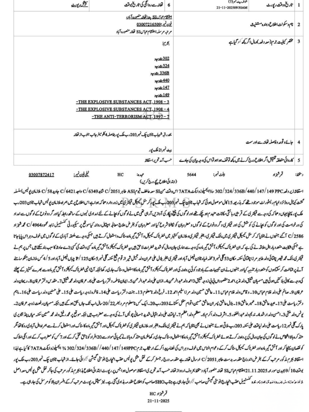 Police have booked the accused under Sections 302, 324, 336-B, 440, 147, 149, Sections 3 and 4 of the Explosives Act, and Section 7 of the Anti-Terrorism Act. A search operation has been launched to arrest all seven suspects.