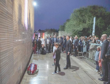 France’s President Emmanuel Macron looks at a lit wall with names of French individuals who fought against apartheid during a commemoration ceremony attended by South Africa’s Deputy President Paul Mashatile in Pretoria. Photo: AFP