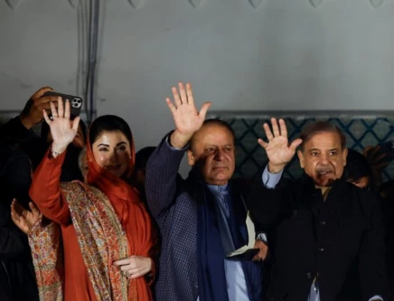 Maryam Nawaz Sharif (L), Nawaz Sharif (Centre), PM Shahbaz Sharif (R) gesture as they gather at the party office of Pakistan Muslim League (N) at Model Town in Lahore on February 9, 2024. Photo: Reuters