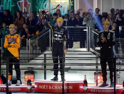 Red Bull's Max Verstappen celebrates on the podium after winning the Las Vegas Grand Prix along with second placed McLaren's Lando Norris and third placed Mercedes' George Russell. PHOTO: REUTERS