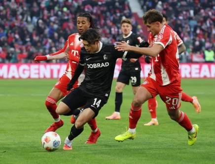 Freiburg's Yuito Suzuki in action with Bayern Munich's Michael Olise and Tom Bischof. PHOTO: REUTERS