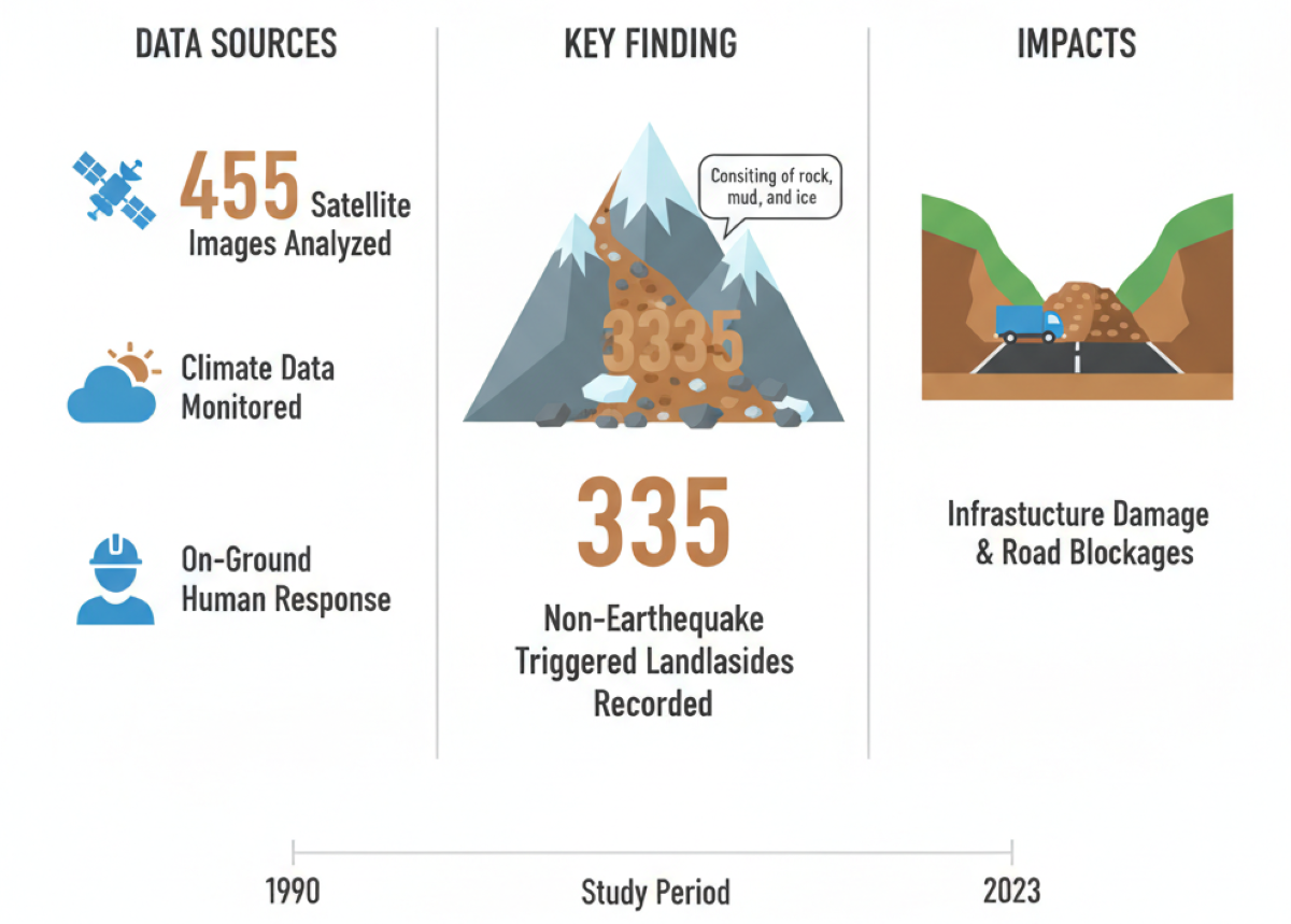 The team studied 455 satellite images, climate data and on-ground human responses during a period from 1990 to 2023, and found out at least 335 landslides took place (not triggered by any earthquake), sending rocks, mud and ice crashing onto the infrastructure and blocking the highway.