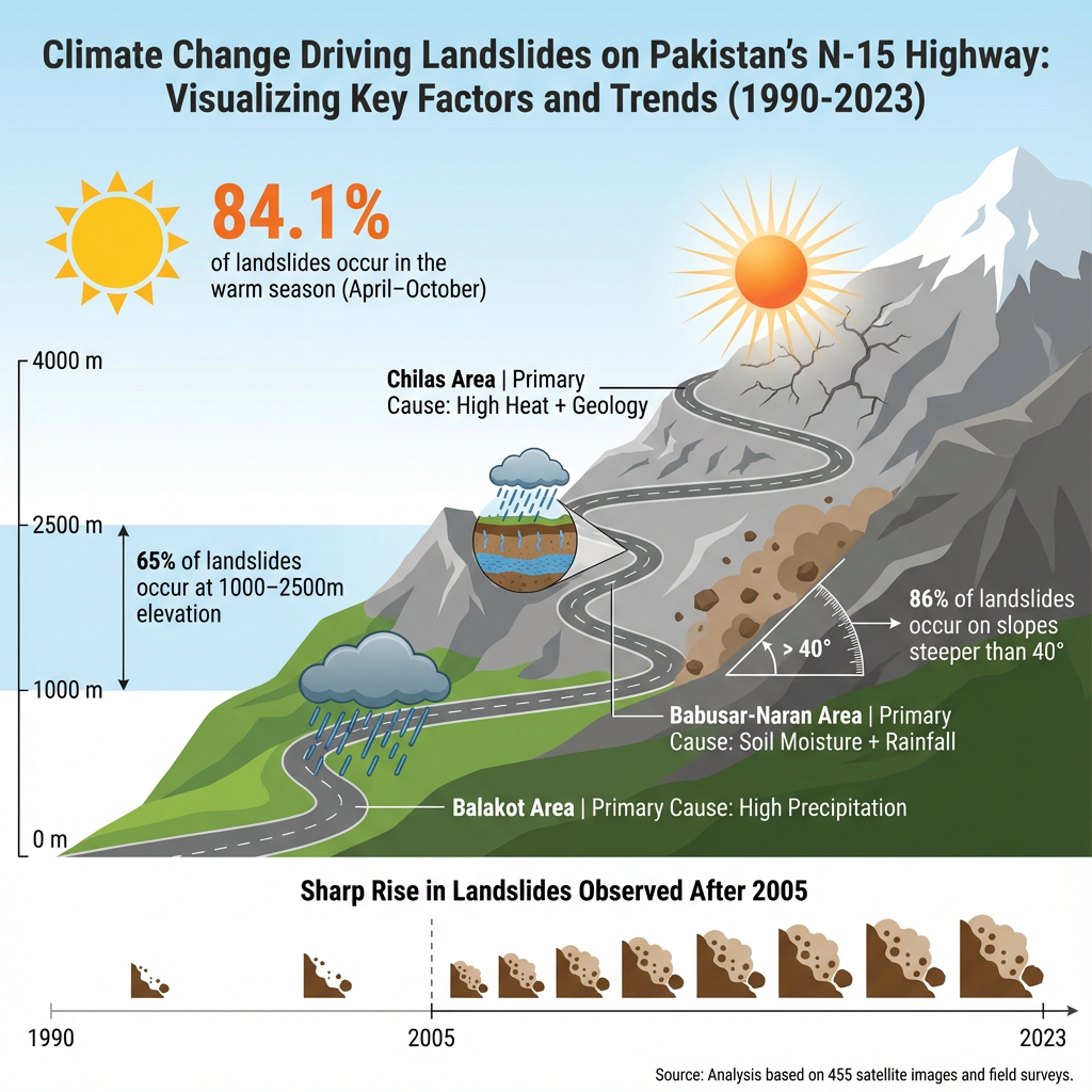 Data also confirms warming and rising precipitation in the area from 1990 to 2023, which aligns with the gradual rise of landslide events.