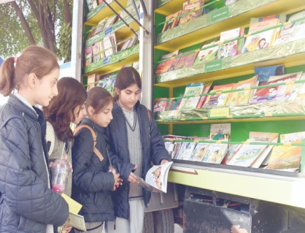 Students browse a collection of children’s reading books, engrossed in the illustrated stories, at the 11th International Book Mela at Lok Virsa in the federal capital. Photo: ONLINE