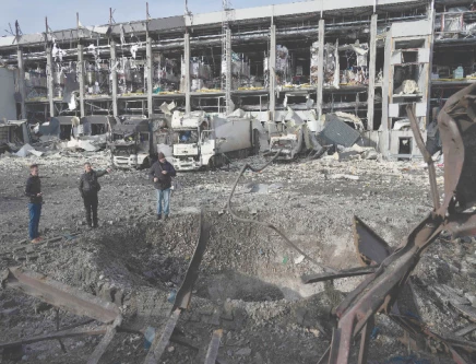 Law enforcement officers inspect a crater next to the heavily damaged logistics hub of the Novus supermarket following Russian missiles and drones strikes in Kyiv. Photo: AFP