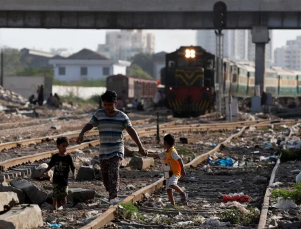 Siblings walk along a railway tracks at a slum area in Karachi, Pakistan July 9, 2020 Photo: Reuters