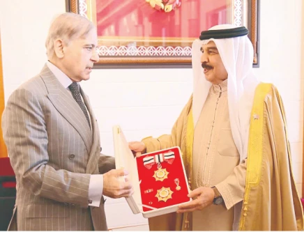 King of Bahrain Hamad bin Isa Al-Khalifa confers the Order of Bahrain upon Prime Minister Shehbaz Sharif in Manama. Photo: INP