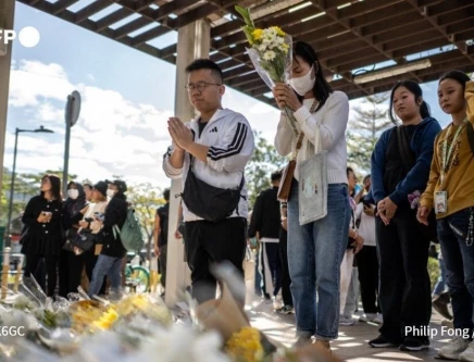 People from across the city flocked to a small park near the charred shell of Wang Fuk Court, the residential complex that burned for more than 40 hours, to place white and yellow flowers and leave handwritten messages of remembrance.