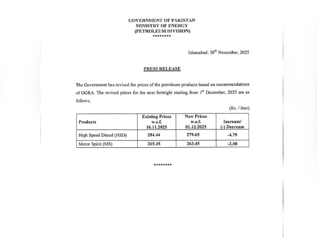 “The new prices will take effect from December 1, 2025, and remain in force for the next 15 days,” the notification said. Petrol prices have been cut by 2 rupees per litre, bringing the price down from 265.45 rupees to 263.45 rupees per litre.