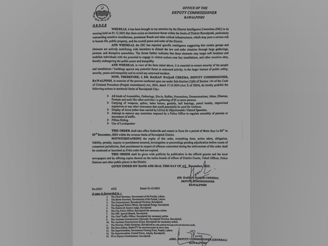 Meanwhile, District Administration has imposed Section 144 in Rawalpindi for three days, effective from December 1st (today) to December 3rd, in response to growing concerns over PTI protests near Adiala Jail.