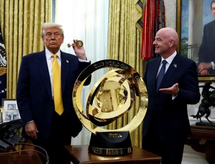 U.S. President Donald Trump and FIFA President Gianni Infantino stand next to the FIFA Club World Cup trophy in the Oval Office of the White House in Washington, D.C., U.S., March 7, 2025. Photo: REUTERS