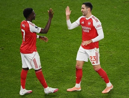 Mikel Merino and Bukayo Saka were on target as Arsenal kept the initiative in the Premier League title race with a routine 2-0 win over Brentford. Photo: AFP