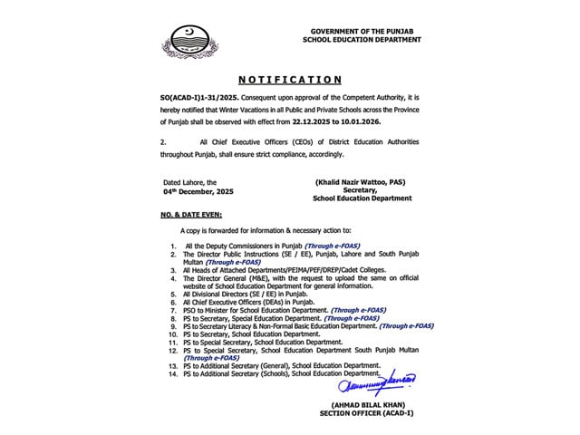 The Punjab School Education Department has officially confirmed the schedule for winter vacations across all public and private schools in the province. The announcement comes after directives from Provincial Education Minister Rana Sikandar Hayat.