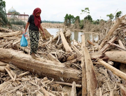 A survivor carries relief supplies while walking through tree trunks that were stranded in an area affected by a deadly flash flood following heavy rains in Karang Baru, Aceh Tamiang regency, Aceh province, Indonesia, December 6, 2025. PHOTO: REUTERS