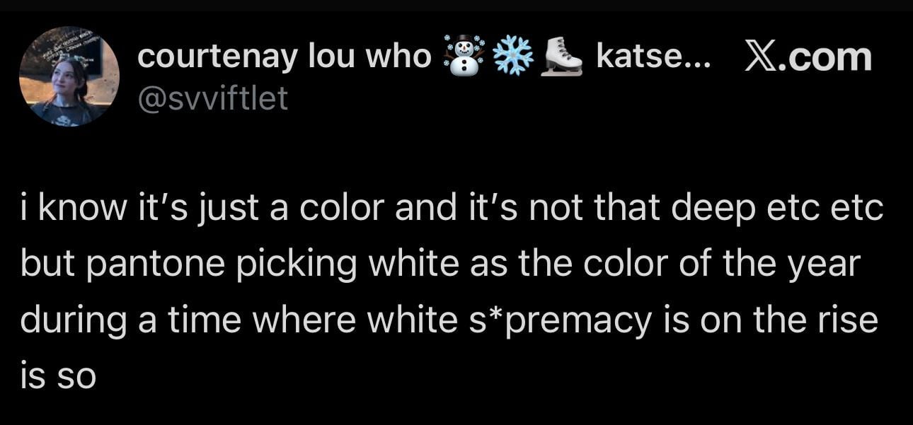 The announcement quickly stirred conversation online, with some critics interpreting the choice through the lens of this year’s social and political climate. They pointed to the rollback of DEI initiatives and the growing visibility of white supremacist movements, suggesting that selecting a color so closely associated with “whiteness” could feel tone-deaf or symbolic of broader societal inequalities. any social media users said the choice was particularly striking this year, pointing out connections to the American Eagle ad featuring Sydney Sweeney — a white woman with blonde hair and blue eyes — in which she referenced having “good genes.” For some, the combination of the imagery and wording carried racial undertones, making the timing of Pantone’s announcement feel especially charged.