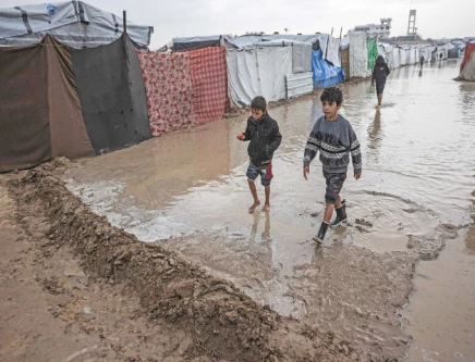 Two boys walk through a waterlogged alley at a makeshift camp housing displaced Palestinians in Deir al-Balah, Gaza. Photo: AFP
