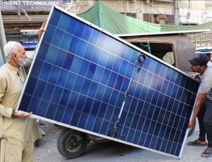Men load solar panels on a rickshaw at a market in Karachi. Source: Reuters