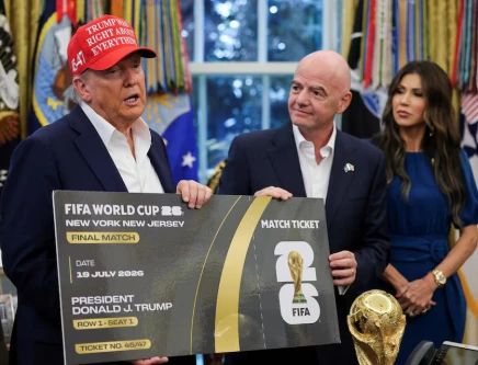 2026 FIFA World Cup final match ticket that was presented to President Trump, as the President makes an announcement on the 2026 FIFA World Cup, while U.S. Homeland Security Secretary Kristi Noem stands, in the Oval Office at the White House in Washington. Photo: REUTERS