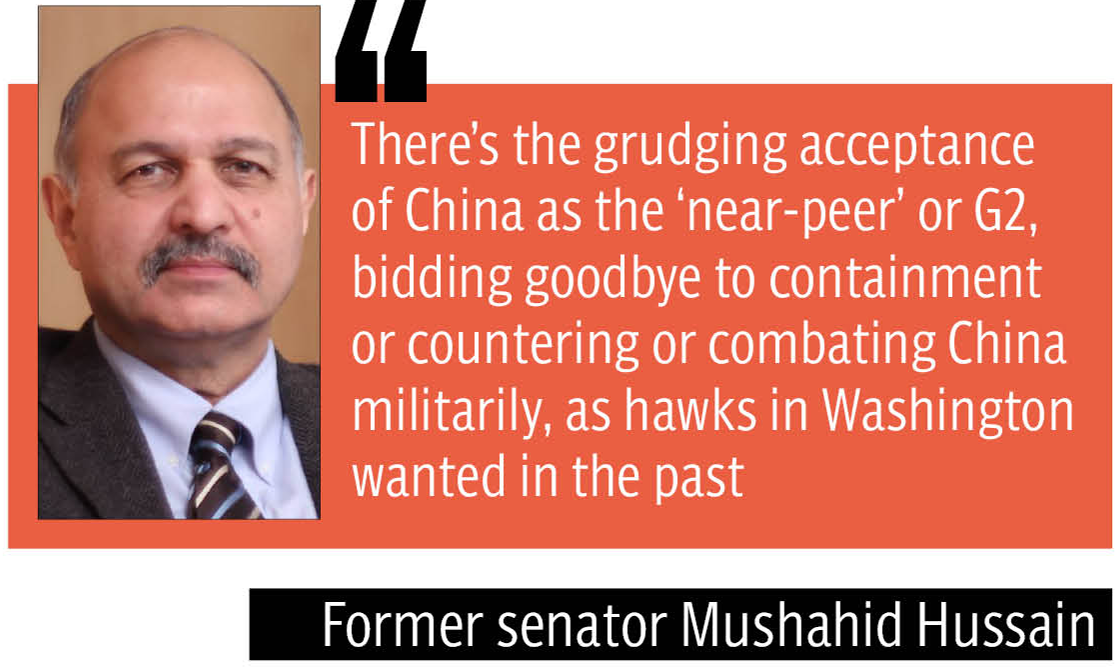 “First, the US is no longer the preponderant ‘sole superpower’ as we now live in a multipolar world. Second, there’s the grudging acceptance of China as the ‘near-peer’ or G2, bidding goodbye to containment or countering or combating China militarily, as hawks in Washington wanted in the past. Third, there’s this realistic focus that drivers for primacy in the future would be essentially non-military,” says Mushahid.