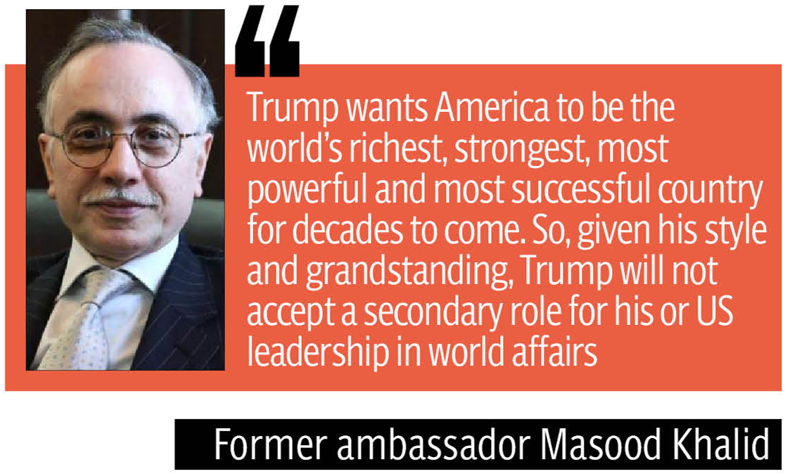 However, ambassador Masood doesn’t think Washington is willing to cede ground. “Trump wants America to be the world’s richest, strongest, most powerful and most successful country for decades to come. So, given his style and grandstanding, Trump will not accept a secondary role for his or US leadership in world affairs. It is a different thing that the interplay of competing interests and contradictory positions may see a lesser acceptance of US leadership.”