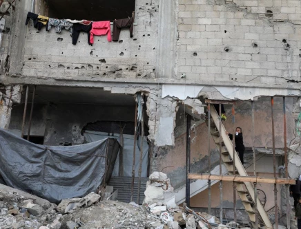 A Palestinian girl climbs a wooden ladder at a residential building damaged during the war, in Gaza City, December 14, 2025.PHOTO: REUTERS