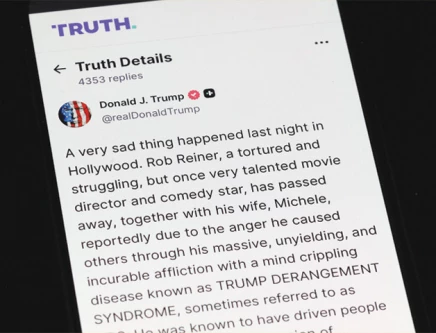 A phone shows US President Donald Trump’s Truth Social post on the death of actor and director Rob Reiner in Washington, DC. Photo: AFP