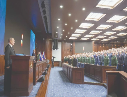 Russia President Vladimir Putin observes a minute of silence during an expanded meeting of the Defence Ministry Board at the National Defence Control Centre in Moscow. Photo: AFP