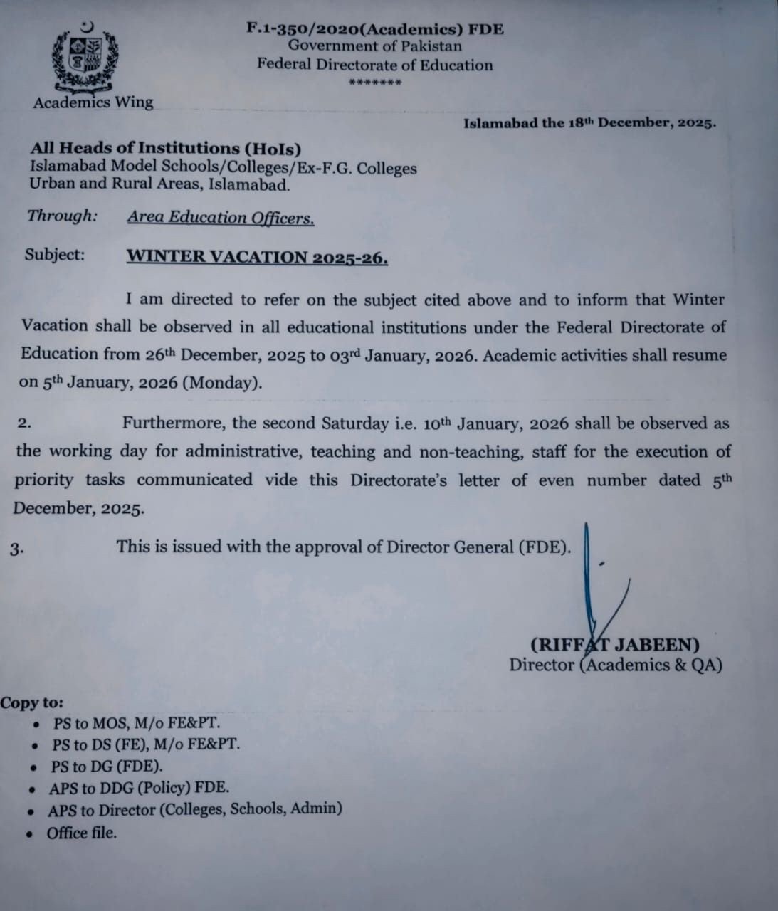 In a separate notification, federal government educational institutions have also declared winter holidays, with schools set to remain closed from December 26 to January 3.