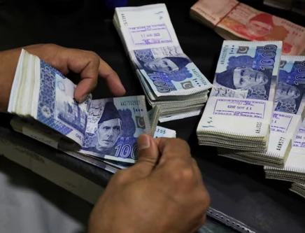 An employee counts Pakistani rupee notes at a bank in Peshawar on August 22, 2023. Photo: Reuters