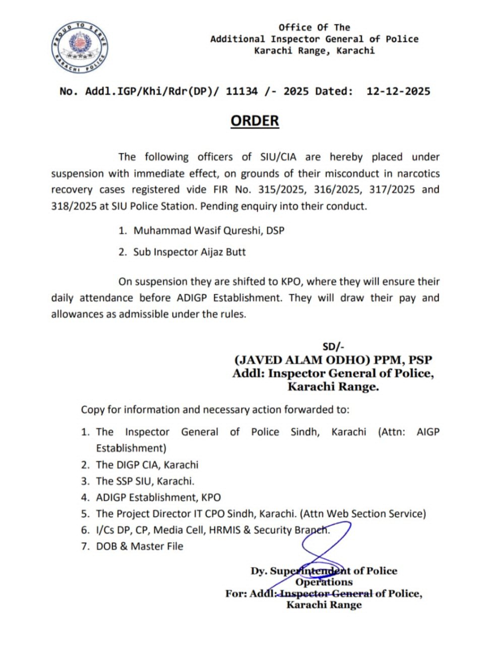 In December, the Special Investigation Unit (SIU) of Karachi Police suspended officers investigating a case involving the alleged sale of part of a 508 kg narcotics consignment, valued at Rs280 million, seized during an earlier operation that led to 14 arrests. The SIU launched an inquiry led by West Zone Deputy Inspector General of Police (DIG) Irfan Ali Baloch.