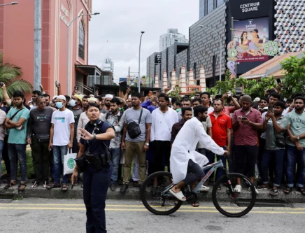 A police officer gestures as people gather outside Angullia Mosque to wait for the body of Sharif Osman Hadi, a Bangladeshi student leader who died following a fatal shooting in Dhaka, in Singapore, December 19, 2025. Source: Reuters