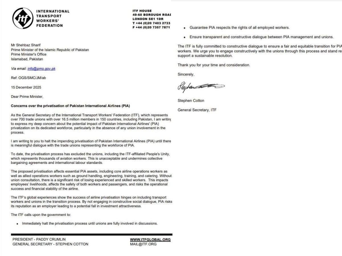 The International Transport Workers’ Federation (ITF) has called for the privatisation process of Pakistan International Airlines (PIA) to be halted immediately, according to a letter from ITF General Secretary Stephen Cotton.