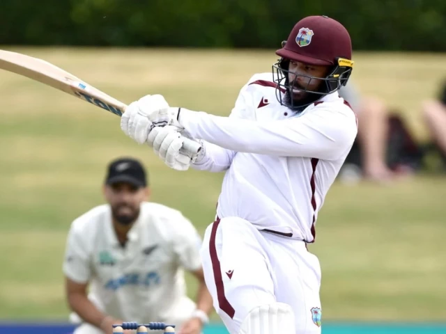 Earlier, Conway resumed on 178 and brought up his second Test double-century, his first since his debut in 2021 against England at Lord’s, when he cut a Seales short ball to the point boundary. His 200 came off 316 balls, with 28 fours.