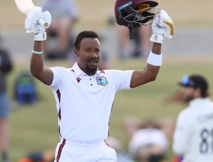 Kavem Hodge celebrates his century against New Zealand. Photo: AFP