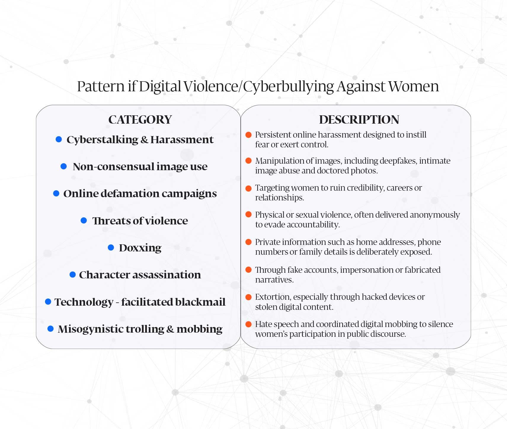 In my professional assessment, digital violence/ cyberbullying against women today spans a broad continuum of harmful behaviours, including but not limited to: