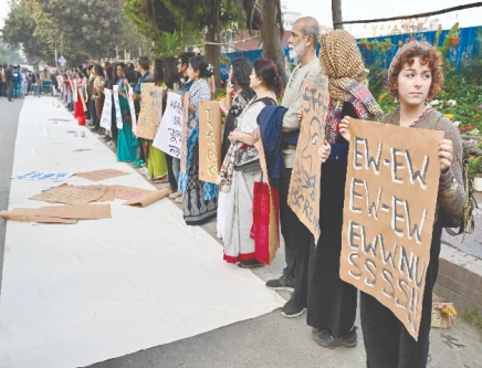 Multidisciplinary artists hold placards during a protest against violent attacks in Dhaka. Photo: AFP